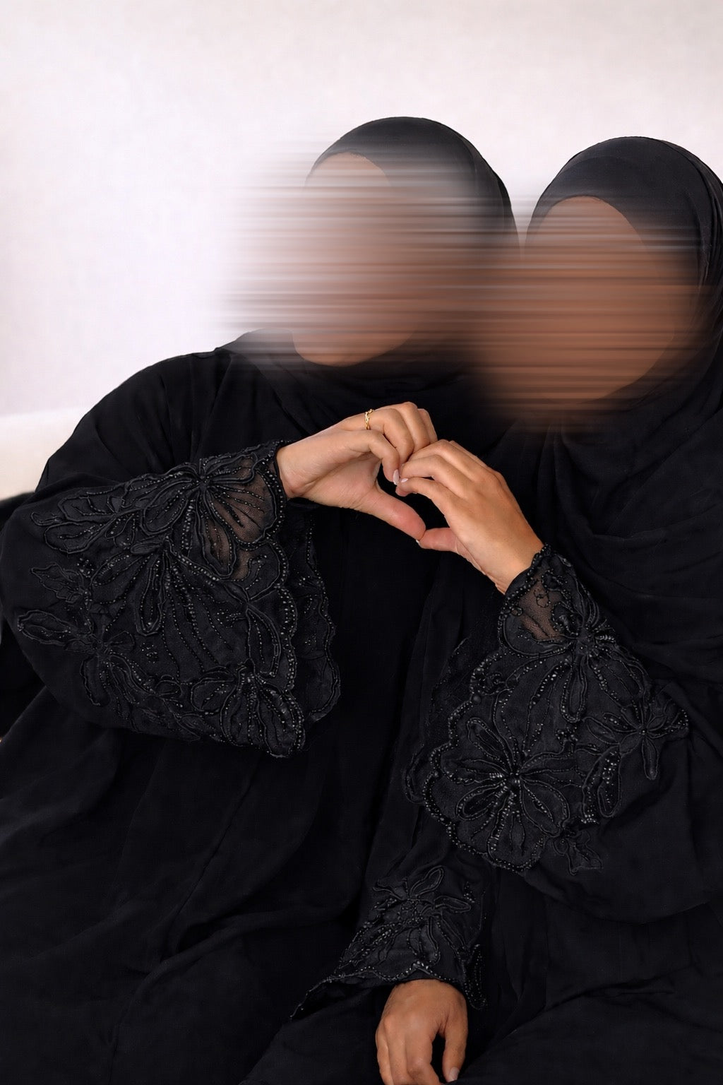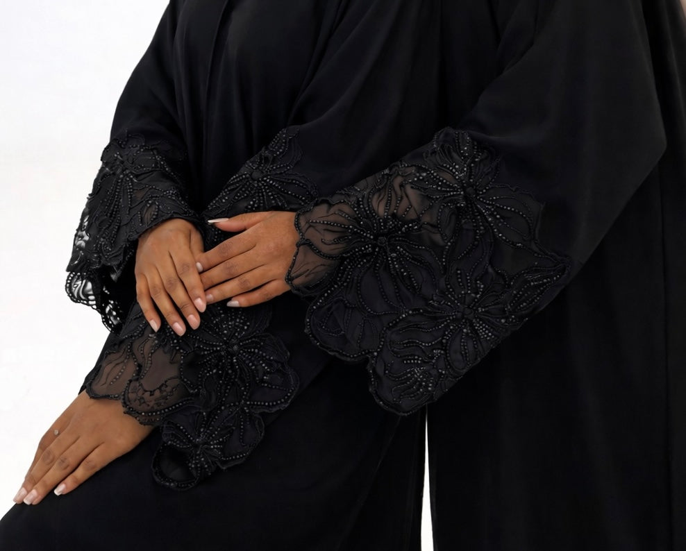C’est la pièce autour de laquelle tout commence. Les manches, subtilement brodées, transforment la abaya en une pièce qui fait toute la différence.